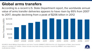 Despite declining in 2013 from a peak of $206 billion, the global annual value of international arms transfers from 2007 to 2017 rose about 65% from about $119 billion to nearly $195 billion, according to the State Department’s Bureau of Arms Control, Verification and Compliance, which compiled the report.